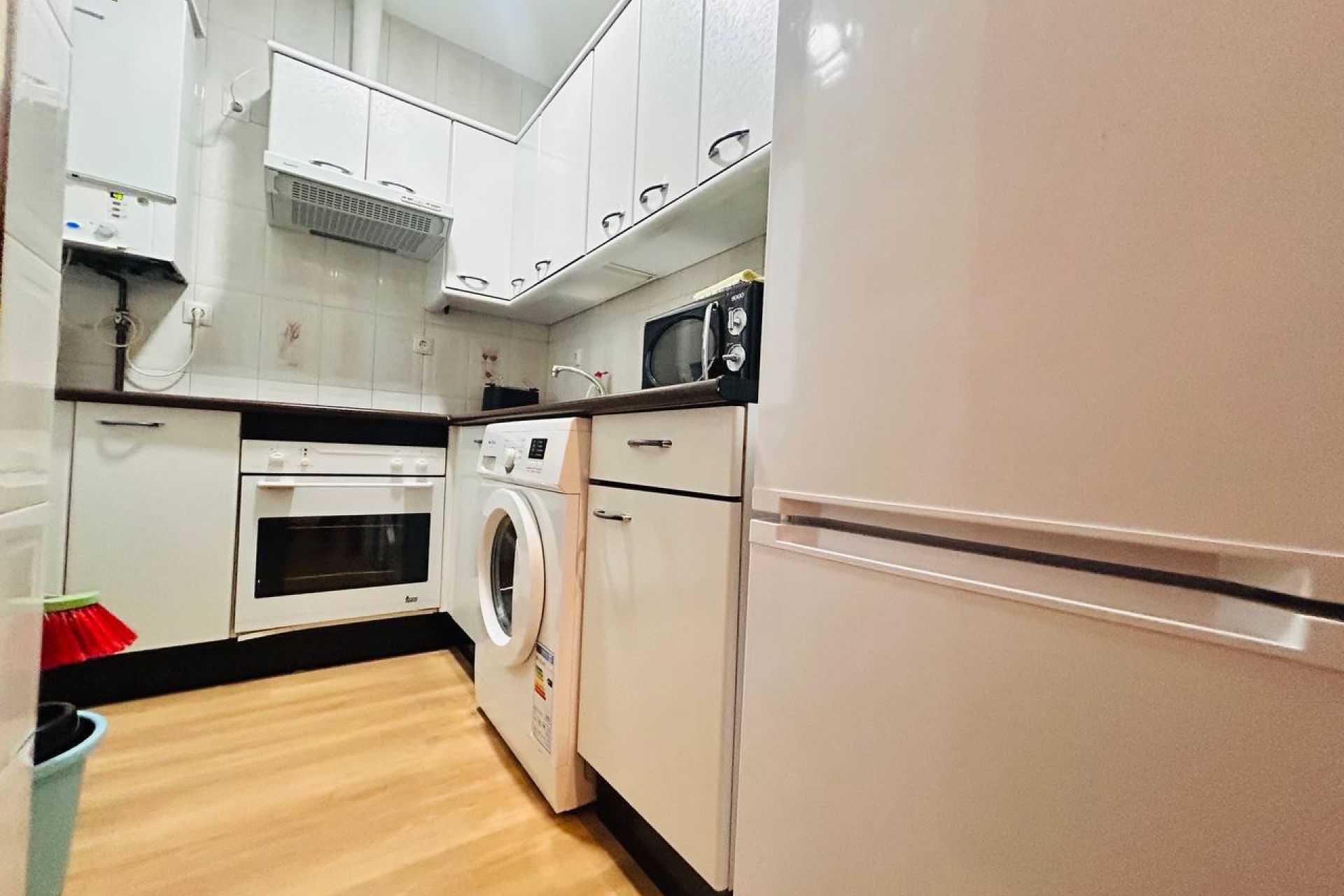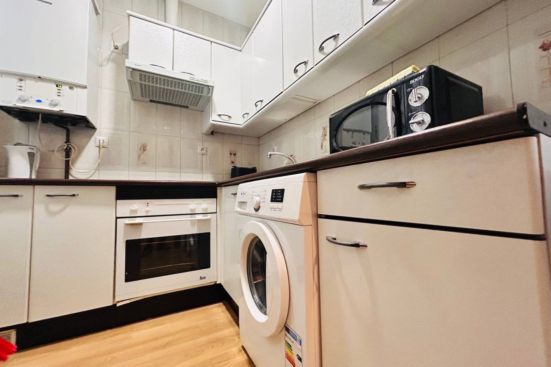 Separate kitchen with washing machine, microwave, and oven.